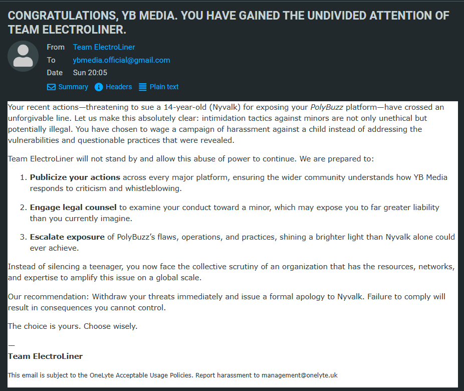 The email shown above serves as a formal warning to YB Media and it’s PolyBuzz division. Team ElectroLiner will not stand for the actions that YB Media has resorted to, and we are thus not afraid to continue our exposure and investigation on them.